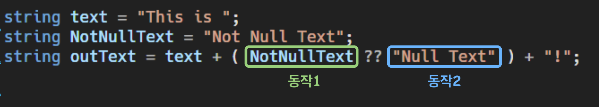 null이면 ?? 문자 뒤(우측)에 있는 동작2를 수행, null이 아니면 앞(좌측)에 있는 동작1을 수행한다.
