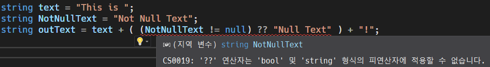 string outText = text + (NotNullText ?? new MyObject()) + "!"; // 체크 타입 불일치, 컴파일 실패