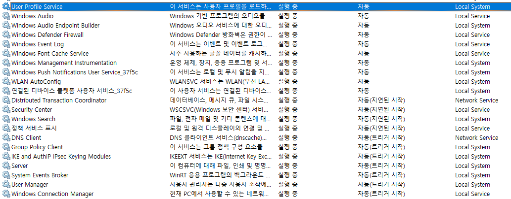 프로그램 개발하는데 문제 없이 윈도우를 사용할 수 있는 서비스 목록이다.