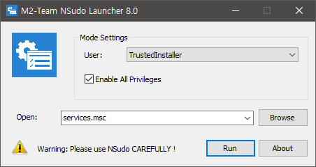 아래 그림과 같이 설정 후 Run을 누르면 TrustedInstaller 권한으로 services.msc를 실행하여 모든 서비스를 제어할 수 있다.