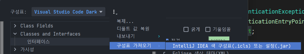 Editor > 색 구성표 > Java 에서 구성표 가져오기를 통해 적용하도록 하자.