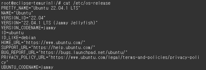 아래 사진처럼 $ cat/etc/os-release 명령어를 사용하여 자세한 정보를 확인할 수 있었다.