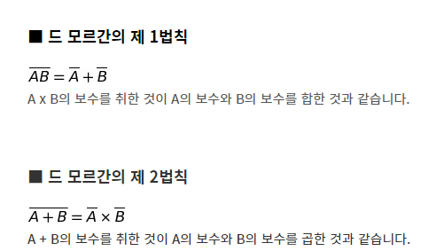 (제1법칙) '전체 논리곱(AND)의 부정'은 '각각의 논리합 부정'과 동일하다는 법칙이다.