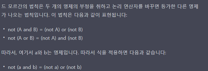 드모르간의 법칙을 통해 조건문을 뒤집어서 풀면 어려운 조건문도 쉽게 보인다.