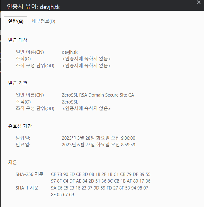사용한 도메인: devjh.tk, www.devjh.tk (ZeroSSL 무료플랜은 서브 도메인을 사용할 수 없다)