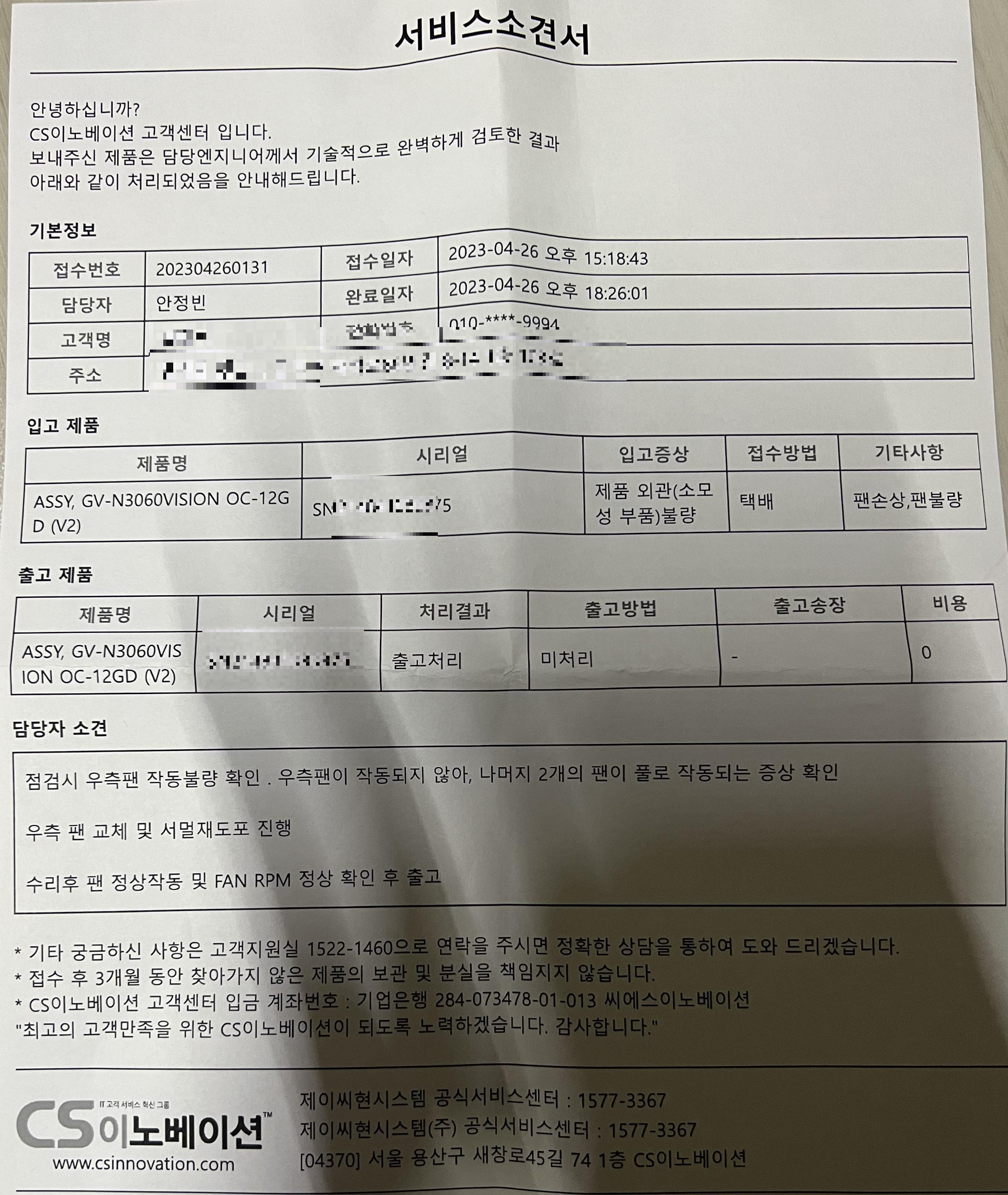 접수번호를 알려줬음에도 불구하고, CS 이노베이션에서 AS가 종료되었지만 어떤식으로 그래픽카드가 수리되었는지
