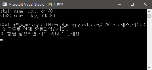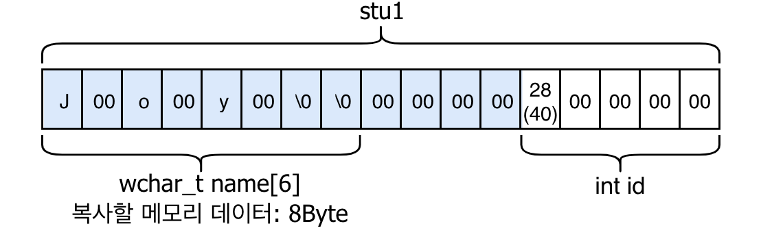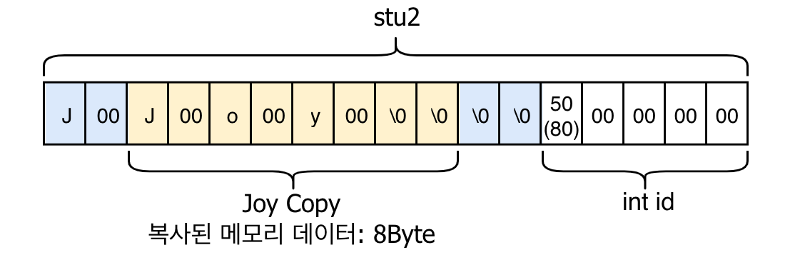 다음은 stu1.name 변수의 메모리 데이터("Joy")를 stu.name[1] 주소에서 복사한 크기만큼 복사하는 예제이다.