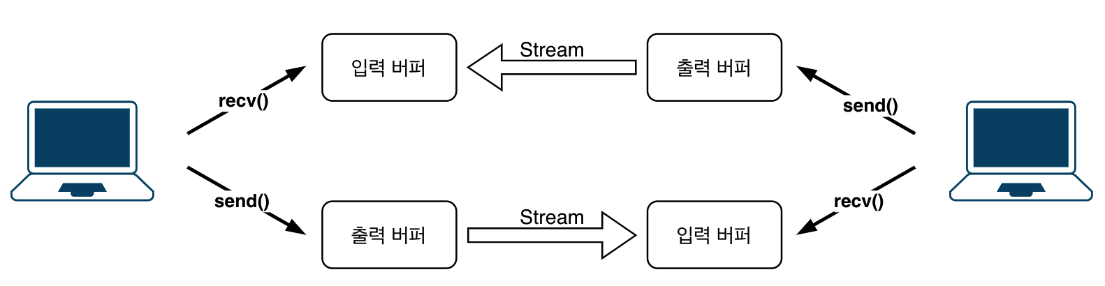 한 호스트의 입력(recv)은 다른 호스트의 출력(send)을 통해 이어진다.