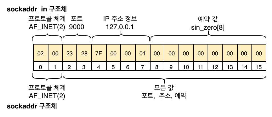 강제 형변환이 가능한 이유는 sockaddr 구조체와 sockaddr_in 구조체의 메모리 블럭과 멤버변수의 크기 모두 동일하다.