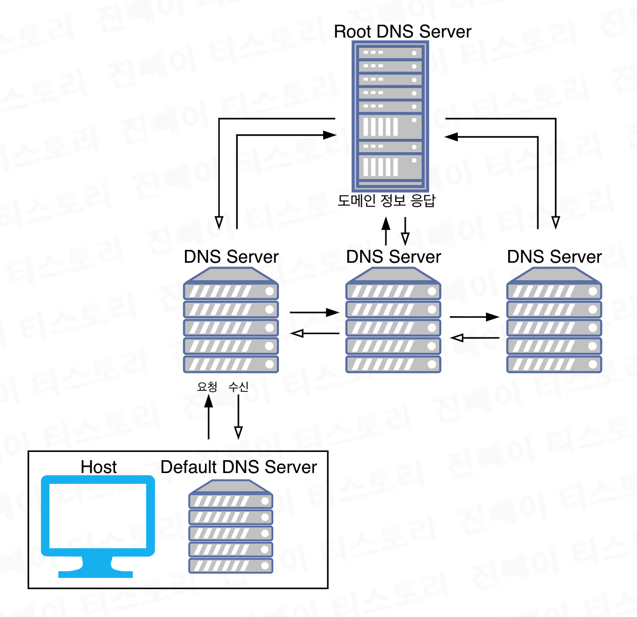 default DNS 서버는 자신이 모르는 정보에 대한 요청이 들어오면 한단계 상위 계층에 있는 DNS 서버에게 물어본다. 상위 계층에 있는 DNS 서버도 모르는 경우 최상위 DNS 서버인 Root DNS 서버에게 요청하게 되며, Root DNS 서버와 질의를 요청받은 DNS 서버들은 도메인 이름에 대한 IP주소 정보를 default DNS 서버에게 전달해야 하므로 요청의 역순 응답하게 된다.